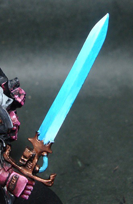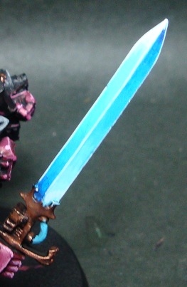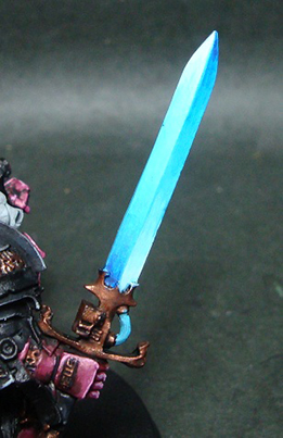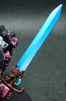 Étape 3 : c’est le moment où commencer à assombrir le bleu ciel avec un bleu plus foncé (en l’occurrence l' »Enchanted blue » ou le « Caledor Sky » GW ). Comme chaque côté de la lame présente deux facettes bien marquées, cela facilite la tâche. Assombrissez d’abord la facette gauche vers le haut et la facette droite vers le bas (ou vice versa, à votre convenance). Puis reproduisez l’opération sur l’autre côté de la lame.