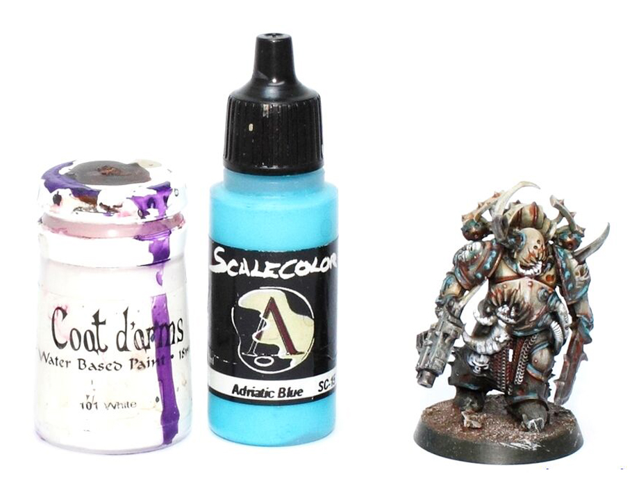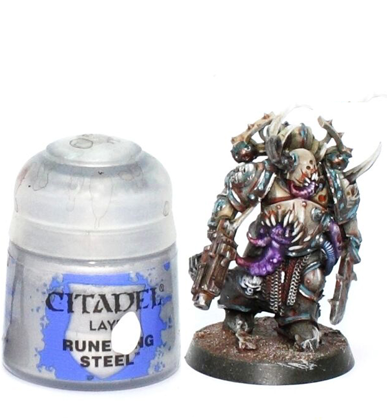 Ajoutez ensuite un peu de blanc au mélange et peignez-le dans les espaces les plus profonds et les raccords d’armure. Le niveau de contraste dépendra de vos envies. Gardez toujours à l’esprit que la figurine se tiendra sur une table de jeu généralement sombre, à distance de bras (au moins), et que les tables de jeu ne sont généralement pas aussi bien éclairées qu’un bureau de peinture.