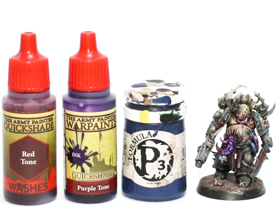 Pour ma part, un lavis violet est appliqué sur les tentacules, avec un peu de rouge vers les pointes. Sur les tubes, j’utilise du bleu foncé (P3 Exile Blue) en une couche très fine et diluée. Il convient assez bien au reste des couleurs utilisées jusqu’à présent.