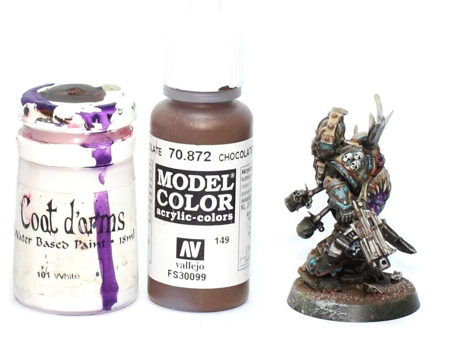 Passons maintenant à l’aspect typique du bois brut sur le corps du bolter. J’utilise Vallejo Model Color Chocolate Brown en couche de base, puis la mélange avec du blanc pour obtenir une couleur crème et blanc cassé, la peinture du bois peut être rugueuse, ce n’est pas bien grave. Vous pouvez également utiliser cette couleur comme base pour les dents et les griffes, les crânes sur l’armure…