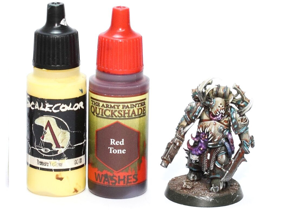 D’abord une étape plus foncée, avec beaucoup de lavis, suivie d’un ton de rouille plus clair dans les plus grosses zones rouillées et les creux rouillés les plus profonds. Techniquement, vous pouvez procéder comme vous le souhaitez, en ajoutant de l’orange ou un peu de jaune au mélange sur les derniers éclaircis de rouille par exemple.