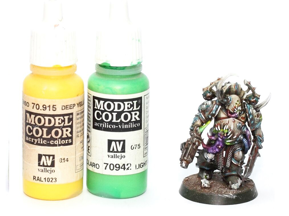 Nous sortons les jolies couleurs ! À cette étape, vous pouvez choisir toutes les couleurs que vous aimez vraiment. Si vous préférez une peau plus verte, optez pour les verts, si vous préférez une peau plus foncée, optez pour cela, et ainsi de suite. Papa Nurgle a une place dans son cœur pour n’importe quelle couleur de furoncles.