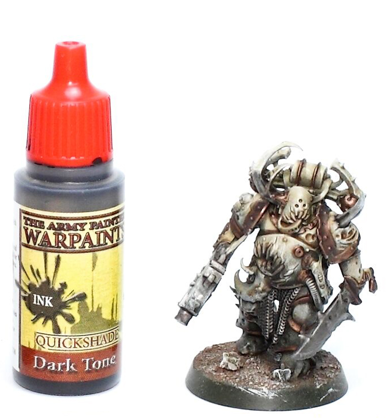 J’applique ensuite une couche de lavis mi-brun. J’utilise les lavis d’Army Painter (similaires aux anciens lavis de GW). N’hésitez pas à en appliquer davantage dans les zones plus à l’ombre, une fois la première couche sèche. Pendant que celle-ci sèche, je gagne du temps en mettant une couche de base de métal argenté sur la lame de l’épée et les parties métalliques du bolter.