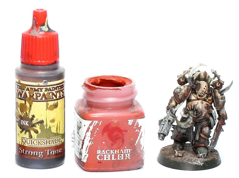 Pendant que nous avons le lavis brun foncé à portée de main, sortez une couleur rouge rouille de votre choix. J’aime utiliser Rackham (oui, cette gamme a aussi des peintures utiles !), car elles sont très mates et un peu granuleuses. J’apprécie aussi le ton de la couleur. Mélangez le lavis brun foncé avec votre couleur rouille et appliquez là où bon vous semble. Je l’utilise pour peindre dans des espaces plus profonds, ajouter des taches de rouille ici et là. Bien sûr, vous pouvez également utiliser le produit antirouille de votre choix, mais je préfère suggérer des matériaux que la plupart des gens ont, plutôt que d’acheter un produit spécifique dont ils n’auront peut-être plus l’utilité ensuite. Je fais de même sur la lame de l’épée et les parties métalliques du bolter.