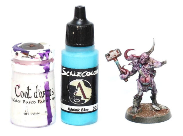 Ajoutez maintenant un peu de blanc à votre mélange, puis appliquez-le dans les creux les plus profonds et sur les zones les plus exposées aux intempéries. C’est à vous de déterminer jusqu’où vous souhaitez pousser le contraste. Gardez toujours à l’esprit que votre personnage sera observé sur une table de jeu, généralement sombre et à distance d’un bras ou plus, et que l’éclairage d’une table de jeu est rarement aussi intense que celui d’un bureau de peinture.