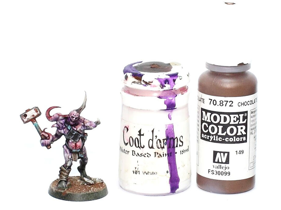 Maintenant, place à la rouille! Sur ce modèle, il n’y a pas grand-chose à traiter, puisque seule la tête du marteau présente des traces d’oxydation. J’utilise pour cela un mélange de lavis brun foncé et d’un rouge rouille. Personnellement, j’aime beaucoup les peintures Rackham (eh oui, cette gamme a encore quelques perles !), car elles deviennent très mates et légèrement granuleuses en séchant, parfait pour simuler une texture de métal corrodé. Et j’apprécie aussi beaucoup le ton de leur couleur. Mélangez donc votre lavis brun foncé avec votre teinte rouille et appliquez-le selon votre goût : dans les creux les plus profonds, sur les zones métalliques abîmées, ou simplement pour ajouter quelques taches de corrosion par-ci par-là. Bien sûr, utilisez les produits que vous préférez, l’essentiel étant le rendu.