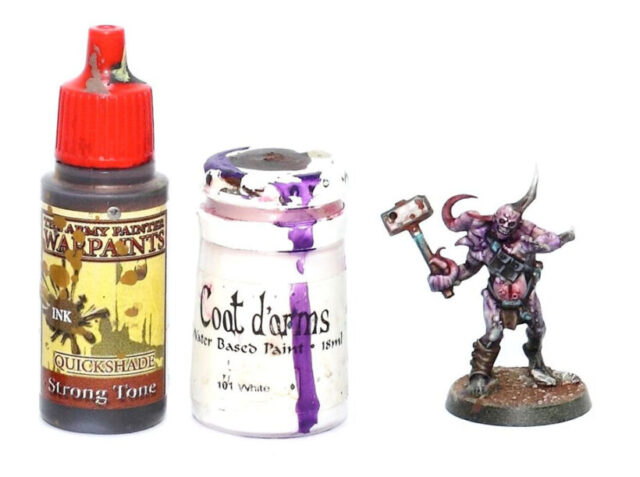 Ces premières étapes sont les mêmes que dans mon guide de peinture pour les Plague Marines, une heureuse coïncidence, n’est-ce pas ? Cela a au moins l’avantage de vous éviter du travail supplémentaire lorsque vous peignez toute une armée. La prochaine étape n’est qu’une approche parmi d’autres, un simple aperçu de ma manière de faire. Ne vous sentez pas obligé de suivre précisément les peintures ou les couleurs que j’utilise. Au contraire, je vous encourage vivement à varier les teintes et les zones d’application d’un Véroleux à l’autre, après tout, ce sont toutes des créatures uniques et délicieusement répugnantes. Sur ce Véroleux, j’utilise différents lavis. Army Painter en propose d’excellents, mais servez-vous de ce que vous avez sous la main ! N’hésitez pas à mélanger vos lavis entre eux, ou même avec un peu de peinture et d’eau (et oui, c’est important : toujours ajouter un peu d’eau à tout). Appliquez ensuite vos mélanges directement sur la figurine. Ne vous inquiétez pas si le résultat semble aléatoire ou si vous débordez un peu sur l’équipement, c’est tout à fait normal à ce stade.