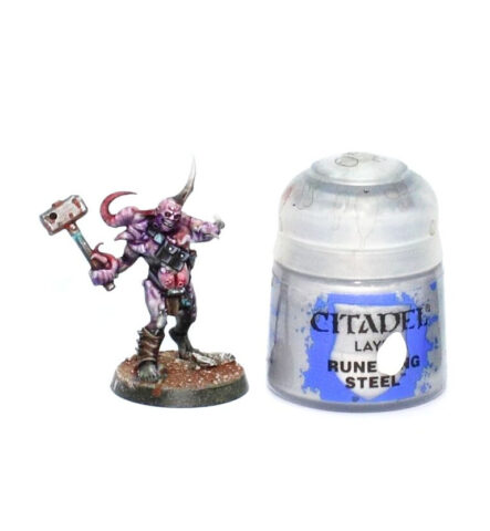 Ensuite, je termine les zones métalliques avec une couleur argentée très claire, comme le Runefang Steel de Games Workshop. J’applique quelques touches sur les parties les plus exposées, par exemple la tête du marteau. Veillez surtout à ne pas trop repasser sur les éléments en étain, sinon ils risqueraient de ressembler à de l’argent. À ce stade, je peins également les boutons et autres petits détails.