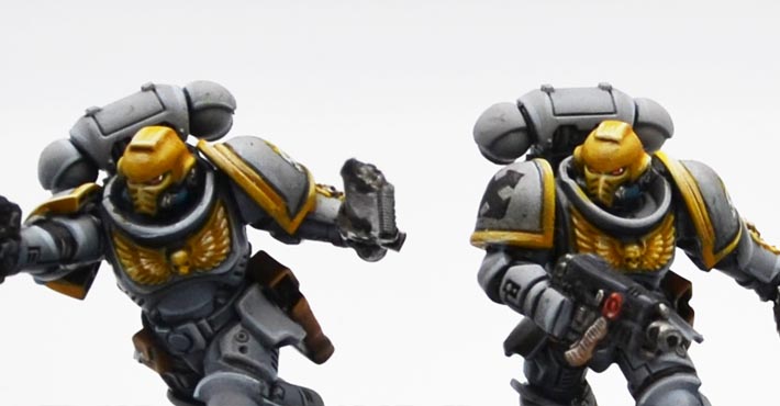 Dans cette optique, nous envisageons d’embarquer plusieurs unités MSU (Multiple Small Units) à bord d’Impulsors (que nous n’avons pas encore dans notre collection), afin de les déployer rapidement sur les objectifs ou directement au cœur du combat. Ce que nous apprécions particulièrement dans cette unité, c’est que Sigur a glissé un clin d’œil aux anciennes méthodes de peinture des armes à plasma, avec ce dégradé jaune-orangé sur le canon. Ce détail apporte une touche de couleur bienvenue à une armée plutôt sobre, tout en rendant hommage au style classique des Space Marines que beaucoup d’entre nous ont connu à leurs débuts.