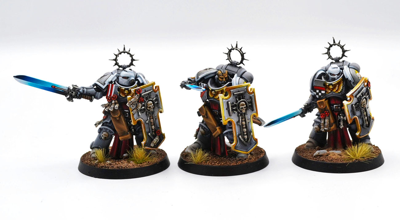 Ces figurines mettent une nouvelle fois en valeur la couleur choisie pour les lames énergétiques de l’armée, qui contraste élégamment avec les teintes plus sobres du chapitre. Vous avez peut-être remarqué que leurs casques sont blancs, contrairement à ceux des troupes classiques. Cette variation n’est pas un hasard : comme pour le contour des épaulettes, la couleur du casque indique la compagnie du chapitre, ce qui explique cette différenciation volontaire de notre part. Voici donc nos trois nouveaux vétérans Bladeguard, prêts à rejoindre le combat et à défendre l’honneur du chapitre.