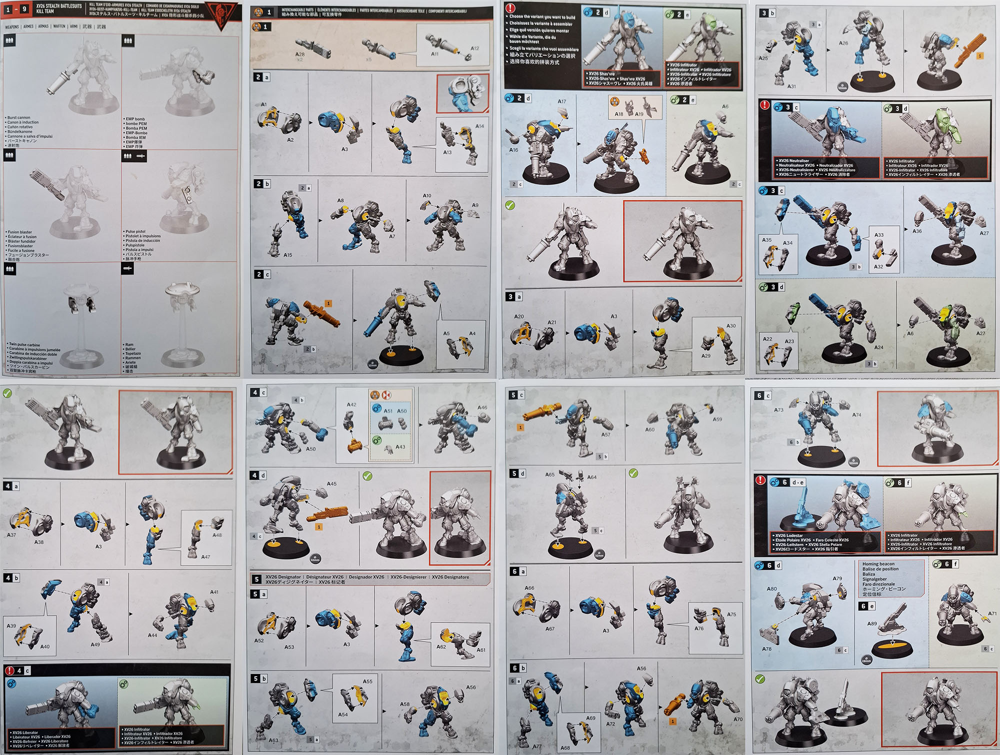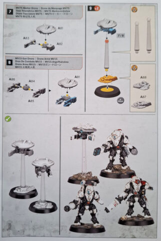Le kit en lui-même n’a pas réellement changé en termes d’options d’armement, puisque les XV26 restent équipées soit du canon à induction, soit de l’éclateur à fusion. Nous avons donc ici une Kill Team qui peut prêter à polémique : à part quelques éléments minimaux sur la grappe, il n’existe pas de véritable identité propre pour chaque membre de l’escouade, ce qui en fait un kit un peu « à cheval » entre Kill Team et Warhammer 40,000. Voici la notice du kit.