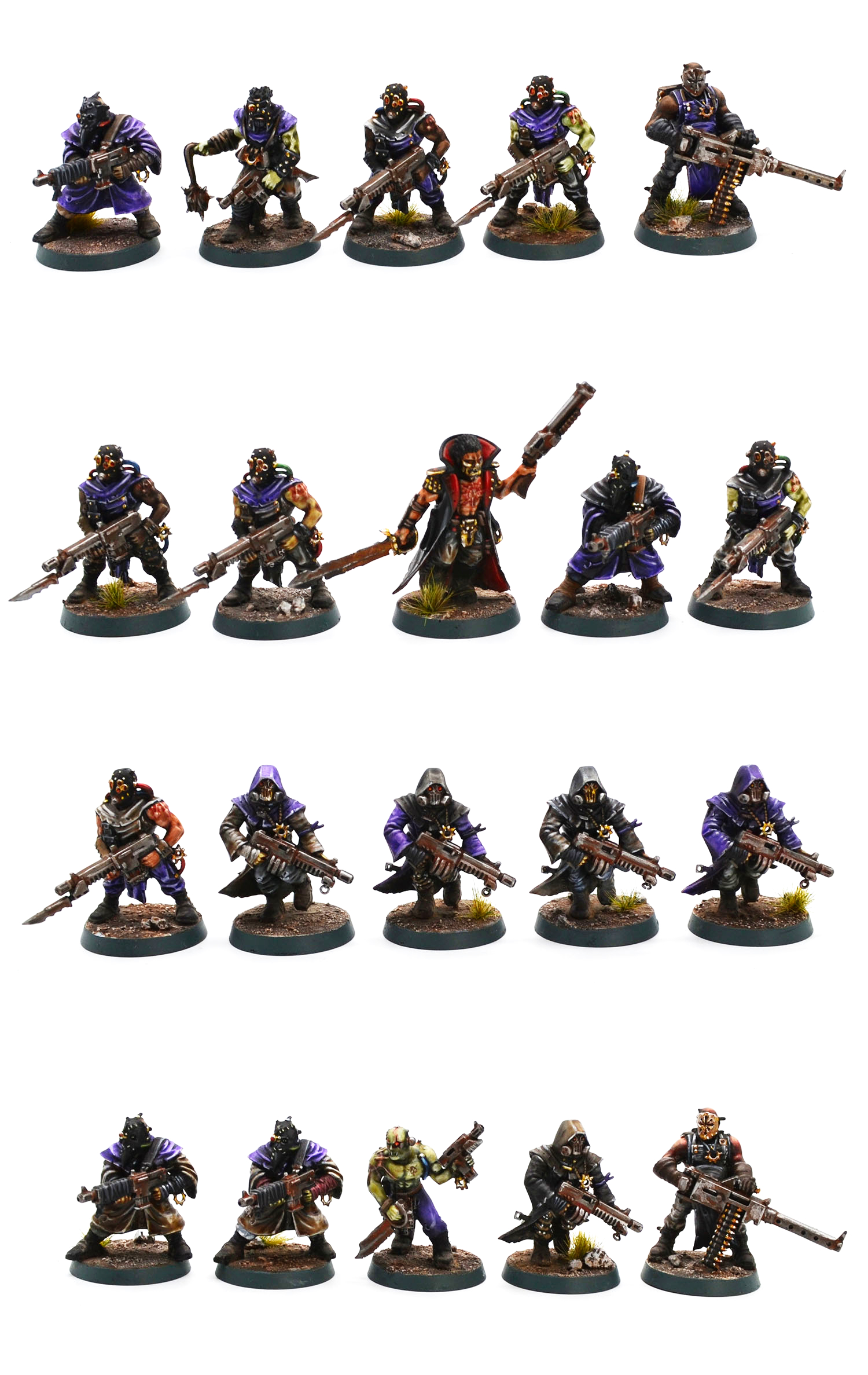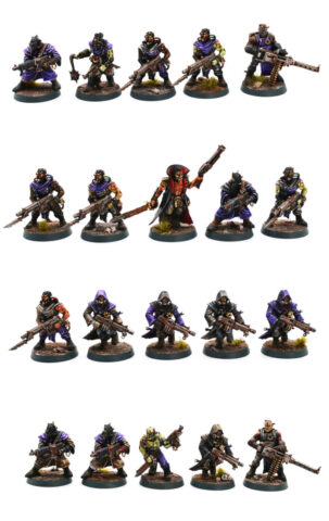 Voici donc notre première bande de 20 cultistes. Le petit point décevant concerne cependant les règles : ils ont perdu l’accès aux armes lourdes. Nous nous retrouvons ainsi dans une situation intermédiaire où davantage de renégats sont disponibles dans la liste du codex, mais sans pour autant retrouver la richesse d’options de ceux qui ont connu les listes du Siège de Vraks de Forge World.