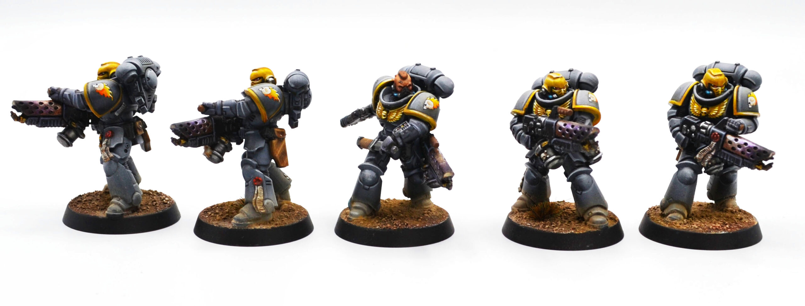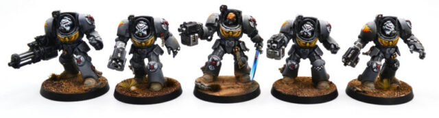Pour accompagner ces personnages, voici notre première escouade de Terminators issue de la boîte Indomitus. À terme, l’armée comptera trois unités de Terminators : une unité orientée tir et deux unités dédiées au corps à corps, afin d’apporter une réelle polyvalence sur le champ de bataille.