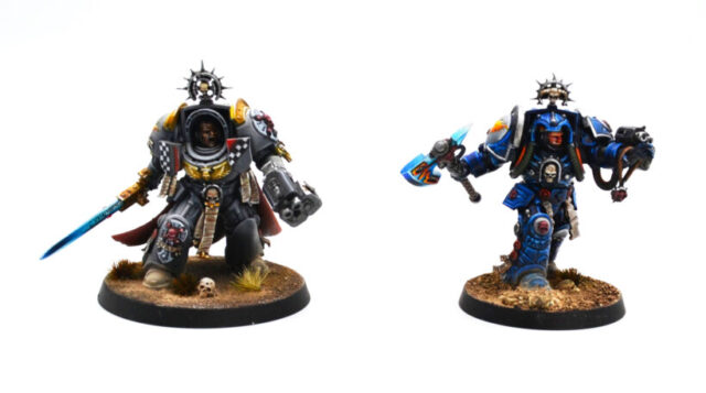 Nous commençons donc par les personnages, avec le Capitaine en armure Terminator ainsi que l’Archiviste en armure Terminator issus de la Combat Patrol. Bien que l’iconographie des Imperial Harbingers diffère de celle du Codex Space Marines, le choix a été fait de peindre l’Archiviste en bleu afin de créer un contraste marqué avec le reste de l’armée et de souligner son rôle psychique. Nous aborderons plus en détail l’historique et l’iconographie du chapitre dans un futur article Index Astartes qui lui sera dédié.