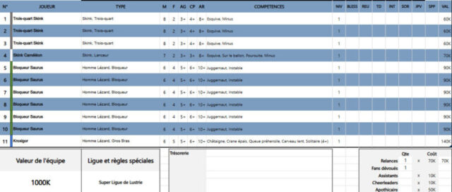Nous avons choisi de partir sur un roster un peu audacieux, que peu de coaches utilisent, en ne prenant qu’une seule relance, mais en alignant l’ensemble des Saurus ainsi que le Kroxigor. L’augmentation du coût des Saurus ne nous permet plus, comme lors de la saison précédente, d’intégrer dès le départ un second Skink Caméléon. Celui-ci est donc remplacé par un Skink classique.