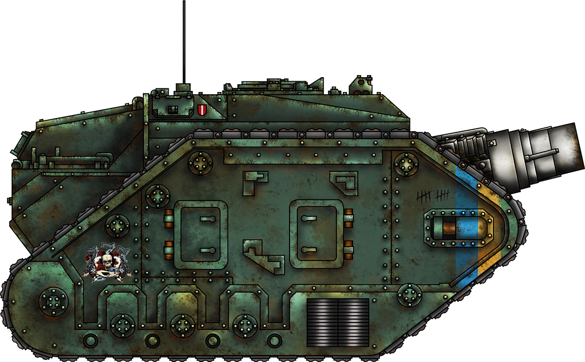 The rear of the tank was damaged by an Ork rocket. The Tech-Priests are currently working on its restoration so that the Leman Russ may once again serve in the name of the Emperor.