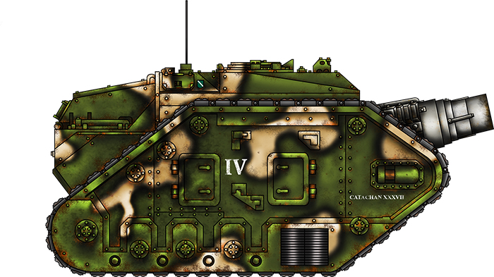 The Catachan Jungle Fighters rarely use these kinds of tanks as support in their guerrilla operations. The 27th Regiment used this vehicle during the Mophos VI campaign. Renegades had set up bunkers and machine gun nests in the heart of the jungle, thus blocking numerous crossing points to strategic locations. In order to prevent massive losses, this Thunderer opened breaches in defensive positions, sowing chaos in the enemy ranks. All the infantry had to do then was pour in and finish off the still-disorientated survivors.