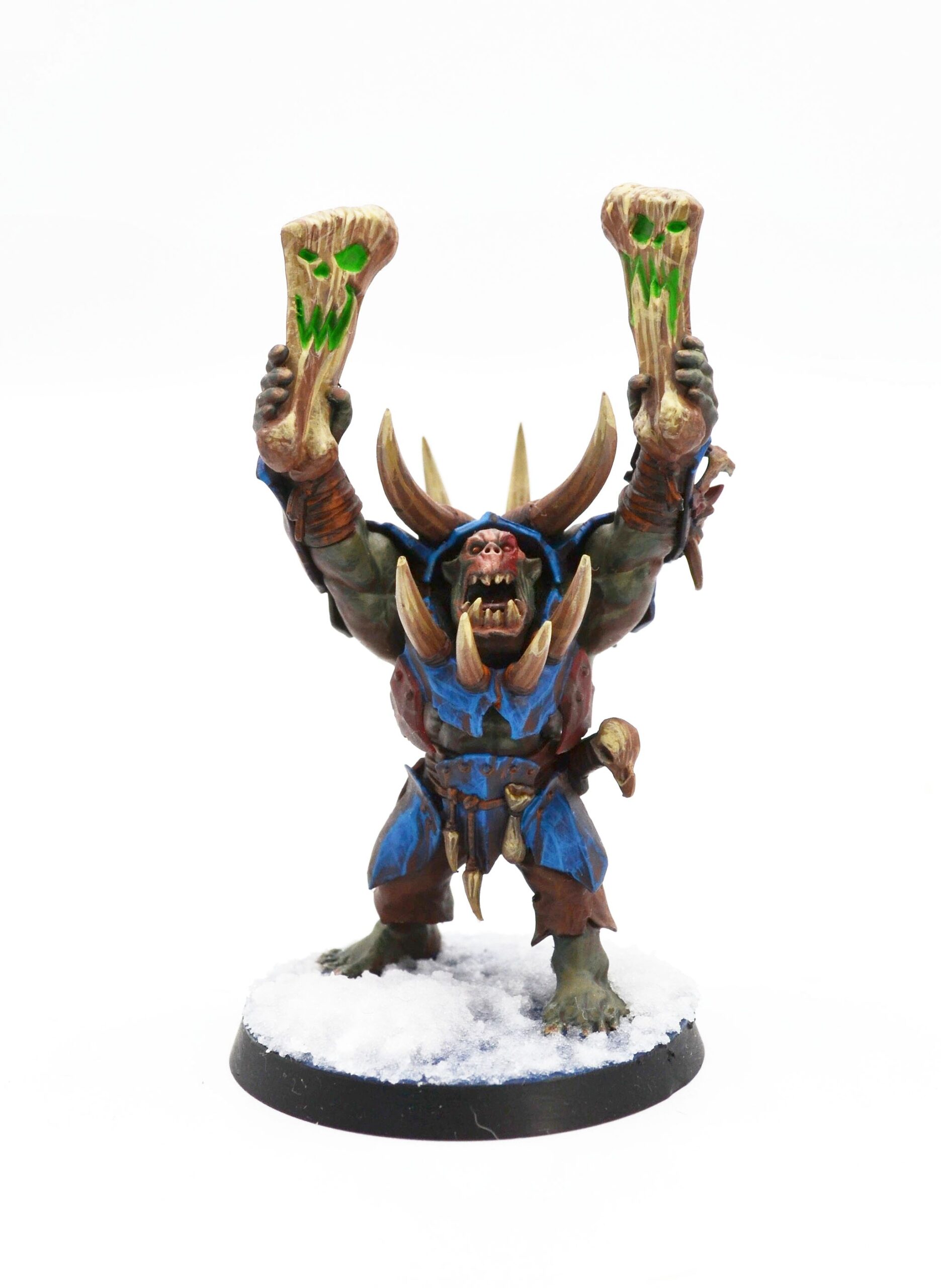 His drum, carved from the frozen bones of a Troggoth, beats in rhythm with battle. Each strike makes the snow tremble; each chant stirs the fury of the Frozen Bones. The orruks claim that when he roars the “Grob’z’Froid”, the ice itself cracks under the might of the Waaagh!.