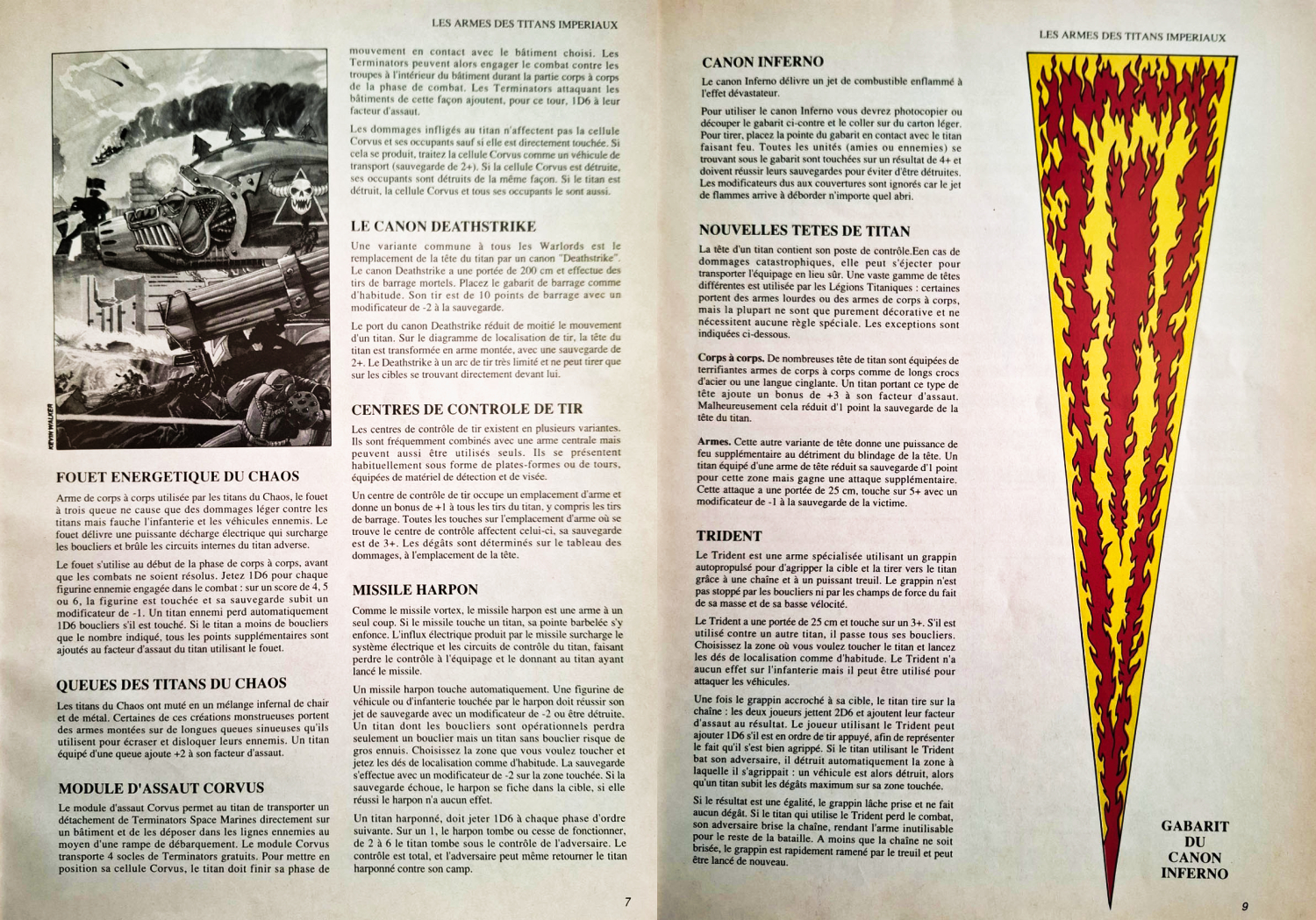 This article introduces the weapons and equipment of the Titans in Epic. It includes a list of twenty different armaments and systems, each accompanied by detailed descriptions and rules. At the time, readers could even cut out a template for the Inferno Cannon directly from the magazine, a small bonus that was quite typical of publications from that era. Among the weapons and equipment featured are: the Plasma Missile Launcher, Power Claw, Carapace Landing Module, Carapace Multi-Laser, Chaos Energy Whip, Chaos Titan Tail, Corvus Assault Pod, Deathstrike Cannon, Fire Control Center, Harpoon Missile, Light Plasma Cannon, Power Ram, Power Saw, Turbo-Laser Destructor, Vulcan Mega-Bolter, Warp Missile, Demolisher Cannon, Inferno Cannon, Titan Head Equipment, and finally, the Trident.