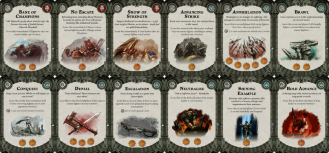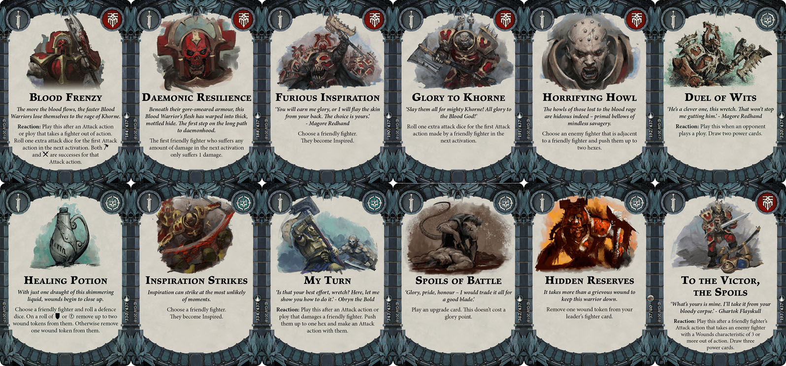 Riptooth, the Flesh Hound, is slightly faster than the rest of the gang, with a movement of 4, increasing to 5 when exalted. And his exaltation is far from trivial: he gains 1 extra damage, 1 additional movement, and an extra defense die. It’s practically essential for him to reach his full potential. Not that there’s a card allowing a fighter to be exalted without any condition, of course. Overall, this gang is clearly designed to quickly rack up victory points by slaughtering opponents. Focusing on objectives is possible, of course, but is that really in the true nature of these servants of Khorne?