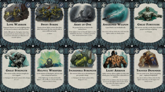The goal, therefore, is to play around the battlefield’s configuration: stretching it out, tightening it at the right moment, and filling gaps to control enemy lines of sight and movement. On your side, avoid being stuck in your half of the board; instead, aim to take the initiative from the first turns. These aggressive opening moves make the Farstriders harder to eliminate and allow them to improve their weapons quickly, making this a key gameplay priority. Your deck should be built accordingly, with any card that allows you to score glory in enemy territory receiving special consideration.